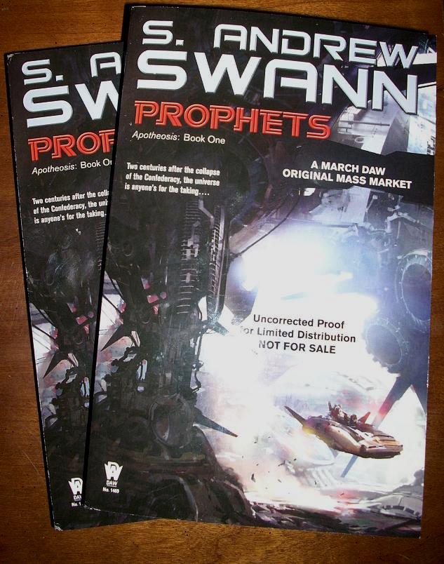 The bound galleys for Prophets, way cool. Having been writing mass market paperbacks all my career, it’s neat to see the books in this faux trade paperback format.