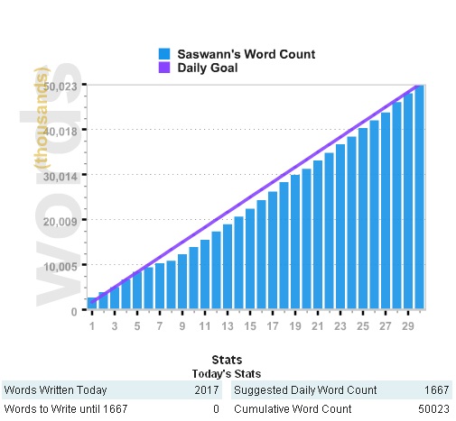 - A demonstration that I could do this without any prep work. Almost everything else I’ve written has had months, if not years, of fermenting ideas before I set first word to page. The two exceptions are notable for being the two other novels where I also approached this kind of productivity for an extended period. (TeeK and Wolfbreed for the curious.) This time round I made a conscious decision to do this with an idea I had driving home from WFC the day before NaMoWriMo started. This suggests I may be able to force my Muse into slave-driver mode. Good to know.