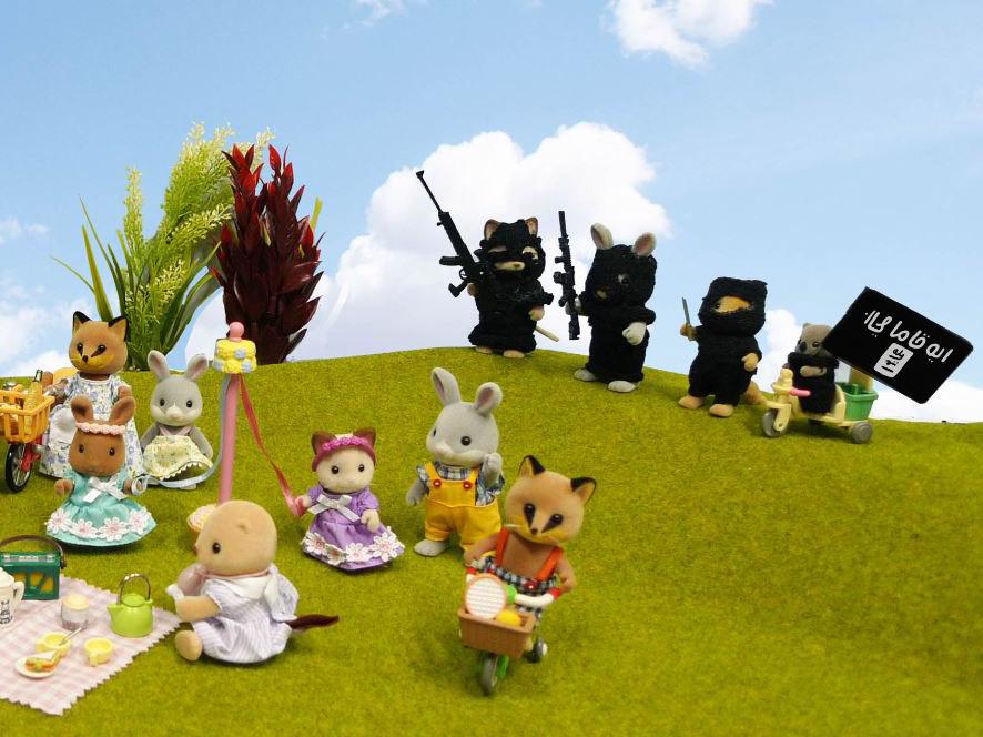 In the work Sylvanian Families dolls are seen enjoying a picnic or a day on the beach, while other black-clad dolls, some of them armed, one carrying a black flag, gather on the sidelines.